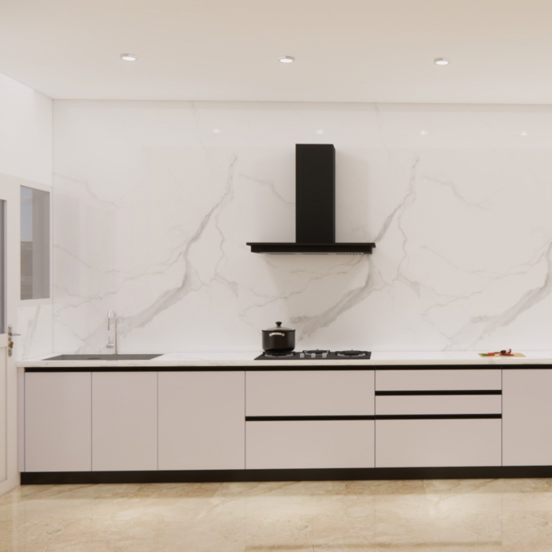 Storage usuage: This 10 ft modern stainless steel kitchen is designed with both style and functionality in mind. The cabinetry features a sleek smoke-coloured laminate with a matte finish, offering a bold yet understated aesthetic. A durable quartz countertop adds a luxurious touch while ensuring resistance to stains, scratches, and heat.